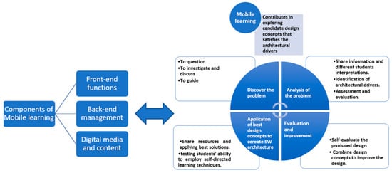 Figure 1 presents insights into the integration of the two learning models. However, from the components of mobile learning, three areas have been identified. These include the front-end functions, the back-end management, and digital media and content. The focus of the front-end function is to send the information back and ensure that instant communication is maintained. The front end provides an interface for the users to interact effectively and also provides other elements of interaction [38]. The focus of the back end is to empower the main functionality of the mobile application. It helps to set paths, set materials, and monitor the overall functionality [39]. In addition to this, mobile learning also fosters digital media and content that helps students and teachers to upload and download lecture materials and other important information sources. Mobile learning also assigns tasks, designs activities, designs instructions, provides adequate resources, evaluates the resources, and provides feedback [40].
