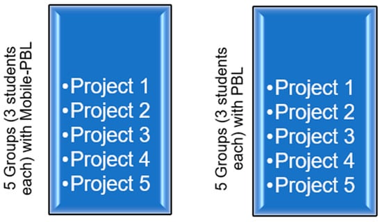 Approximately 30 students taking the software architecture course were chosen in the current scenario. As shown in Figure 3, the lecturer (the first author) divided the students into ten groups of three students each and gave each group five projects to complete over the semester (one project at a time, not all together). All class projects were required to assess the effectiveness of the Mobile-PBL model.