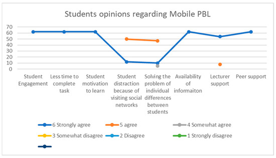 The findings of the survey completed by students who received education utilizing Mobile-PBL over the three semesters are shown in Figure 5 (the 15 students who employed PBL alone are also included because they were allowed to use Mobile-PBL to repeat the last project). The findings show that most students who used Mobile-PBL strongly agreed or agreed that the approach improved their engagement, reduced the task completion time, increased their motivation to learn, helped to address the issue of individual student differences, increased the availability of information, and helped to improve lecturer and peer support.