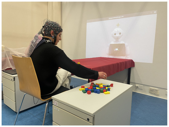 Participants were seated in front of an empty table at the CSL lab, with the EEG recording equipment on a smaller table on the left side and an assortment of items to place on the table on the right side. In front of the participant (behind the table) was the projection of the live video stream of the Pepper robot. The image was placed and scaled in a way that participants had the impression of Pepper standing behind the table. A microphone hanging from the ceiling recorded an audio stream from the CSL lab, and two cameras captured a top-view of the table as well as a frontal recording of the participant.