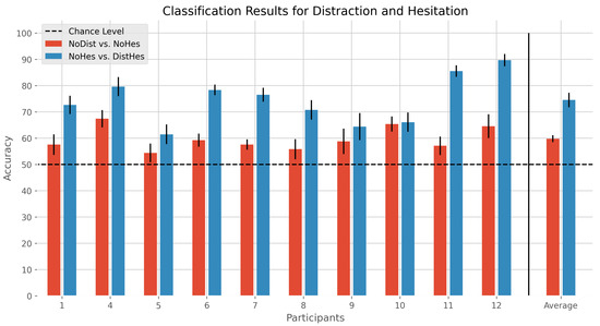 Using a combination of the theta and alpha band (4–12 Hz) yielded the best results for the SRQ1 (NoDist vs. DistNoHes). The average accuracy across all participants was approximately 60% (STD 5%). A two-tailed t-test comparing our results to the baseline accuracy of 50% revealed a statistically significant difference for all participants (t(11) = 2.719, p < 0.05). The effect size, as measured by Cohen’s d, was 0.43, indicating a medium effect. Using a combination of the theta, alpha, and low-beta band (4–20 Hz) yielded the best results for the SRQ2 (DistNoHes vs. DistHes). The average accuracy across all participants approximately reaches 73% (STD, 10%), significantly outperforming the baseline for each participant (t(11) = 7.757, p < 0.001) with robust classification results for more than half of the participants. The effect size, as measured by Cohen’s d, was 1.7, indicating a large effect.