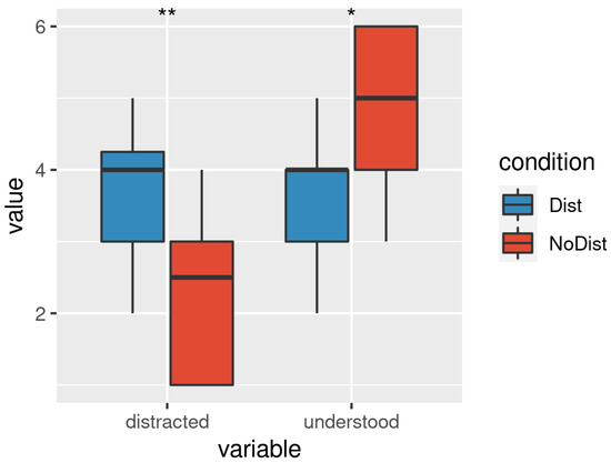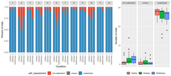 The participant’s self-reported non-understanding of the instructions differed on average. In the NoDist condition, the average of not understanding instructions was ; in the DistHes condition, ; and in the DistNoHes condition, . However, this finding did not reach statistical significance, .