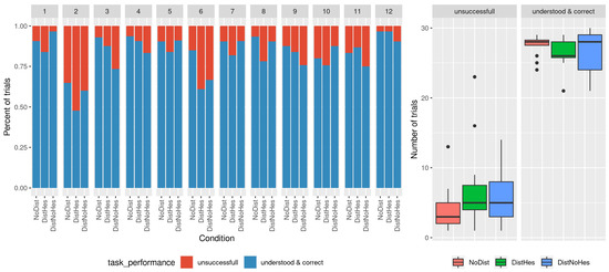 Figure 7 depicts the understanding (problems) for each participant on the left and over all participants on the right. The blue portion of the bar plots represents all trials in which the participant “understood” Pepper and correctly performed the corresponding action. The red area subsumes all cases in which the interaction was “unsuccessful”, so an understanding problem occurred: the person was unsure whether they understood the actual instruction, asked for a repeat, or performed the action incorrectly. The number of “unsuccessful” interactions was statistically significantly different for the three conditions, . In the NoDist condition, the participants had, on average, “unsuccessful” instructions, whereas in the DistHes and the DistNoHes conditions, the average “unsuccessful” instructions were higher (, ). The post-hoc test showed only a significant difference between the ambient and the conditions with distraction (whether with or without hesitation) and no difference in the distraction conditions with and without hesitation (see Table 3).