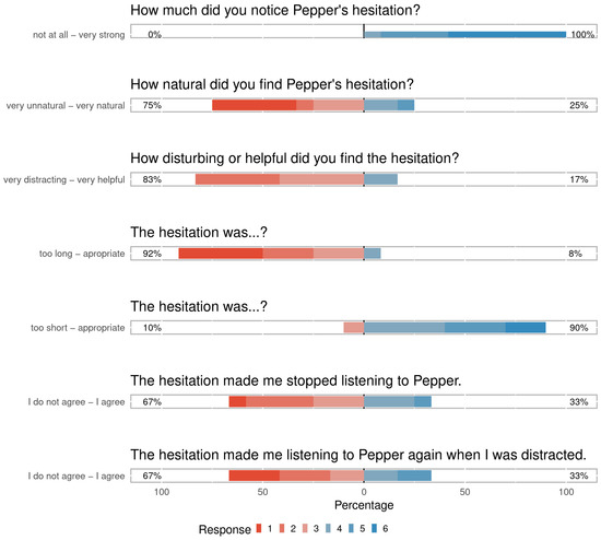 Pepper’s hesitations were predefined and generated during the normal synthesis process with Pepper’s ALAnimatedSpeech interface. As a hesitation strategy, we adapted the hesitation strategy for synthetic speech proposed by Betz et al. [47], which has already been tested in an HRI scenario [10]. To make sure the hesitations are recognized as hesitations and not as a normal break, we decided to use an additional silent pause of 1500 ms before the filler and 1000 ms after it. However, the actual total pause in Pepper’s speech synthesis was about 3.5 s before the filler and 2.5 s after it (this included Pepper’s normal speech pauses, synthesis processing delays, and delay in feedback on the current status of the end of synthesis). Pepper kept gesturing during the breaks. The German filler word “ähm” was played back 50% slower and with a pitch of 80% of the normal voice. In addition, the word before the first silent pause was reduced in speed rate (50%) as well to lengthen the word as an initiation of the hesitation.