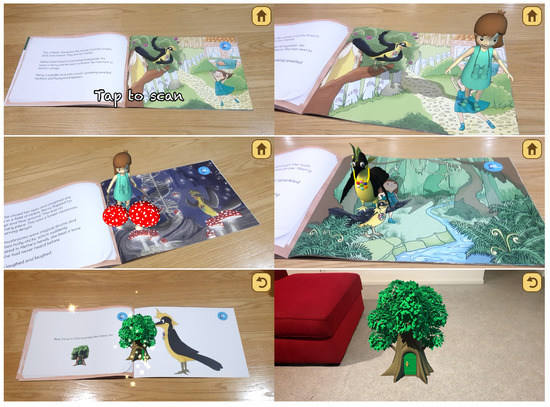 The FC experience can keep children motivated even without the immediate presence of the teacher. This property of AR has been linked to improved learning outcomes in other studies [52,53]. As an example, the talking magical tree (see Figure 2) is triggered by an AR marker but can then be detached from the book and placed in part of the classroom. The students can make the tree talk by a tap on the screen while the tree showers golden sparkles around the view of the student’s environment. This provides a virtual instructor as part of a highly engaging experience.