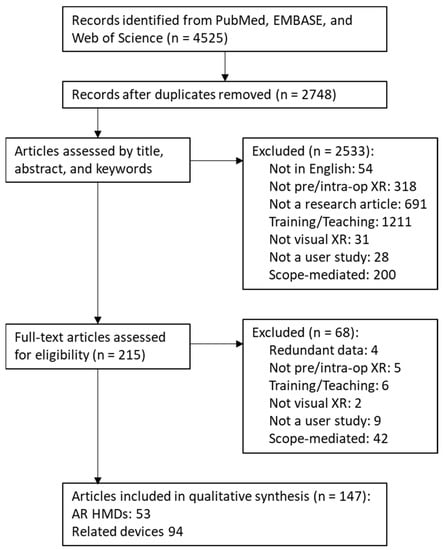 For the remaining 215 records, their respective articles were subject to an in-depth, full-text analysis performed by five of the authors (E.J.B., K.F., A.S.K., K.L.K., and H.L.B.). To start, 10 articles were analyzed by each author, and the results were compared and discussed to arrive at a consistent coding approach. Coding involved extraction of data pertaining to the display hardware used, XR+ visualization type, displayed information, medical specialty, task information, user demographics, usability assessments, and dependent variables. The remaining articles were then divided among the group, coded, and later reviewed by one author (E.J.B.) for consistency. The extracted information was organized to interpret the trends in (1) device type and number of studies per year, (2) distribution of applications by medical specialty and in preoperative vs. intraoperative settings, (3) user demographics related to experience level, sex, and age, and (4) usability and related assessments. Information related to medical specialty grouping and terminology was reviewed by a surgeon (B.B.). During this phase, an additional 68 articles were excluded for the above-mentioned criteria, leaving 147 articles for qualitative data synthesis (Supplemental Table S1). Fifty-three articles described assessments of AR HMD devices.