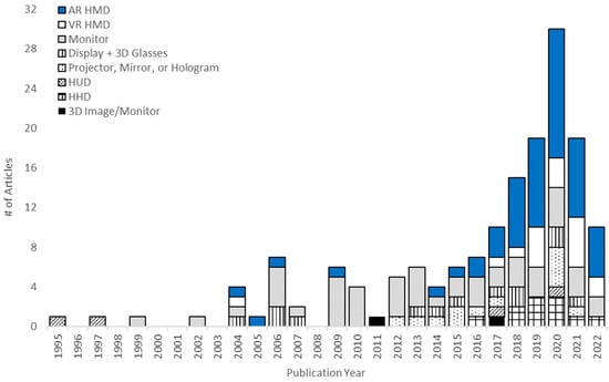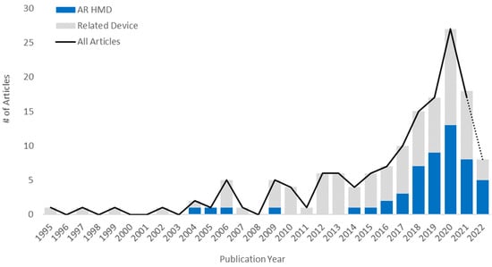 The 147 articles included for data synthesis were published from 1995 to September 2022 (Figure 2). Fifty-three articles described the use of an AR HMD, the first of which was published in 2004.