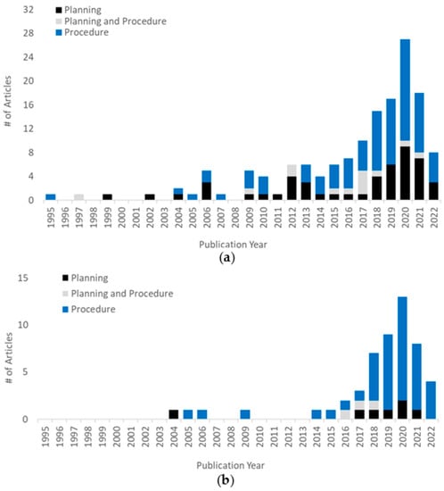 Time distribution of (a) XR+ and (b) AR HMD usability articles for surgical planning vs. procedures.