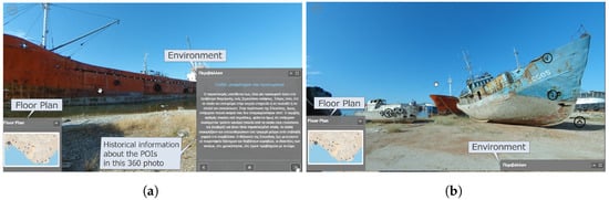 360-degree virtual tour. (a) The map and narration window are visible; (b) The “i” icons can be used to view content relevant to the image’s details, whereas the arrow moves towards another POI.
