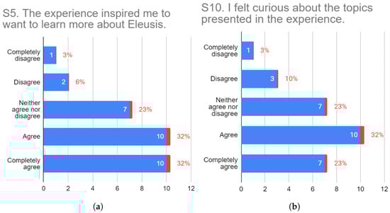 Our results suggest that the experience motivated curiosity about Eleusis. Users felt “curious about the topics presented in the experience” (S10 in Table 1) and inspired to learn more (S5 in Table 1), as also shown in Figure 4.