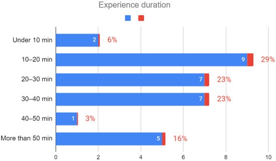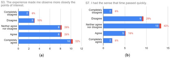 Figure 6 presents the experience duration as self-reported by the participants. Considering that the approximate duration to listen to the content of each POI entirely is about 40 min, 6 users (19%) seemed to have stayed in the virtual tour longer, possibly to explore the panoramic views more after the end of the narration. Most participants (46%) spent 20–40 min with the experience. Only 2 (6%) spent under 10 min. The questionnaire statement “S7. I had the sense that time passed quickly”, with an average AV = 2.9 (Figure 6), on the whole, reflects the sense that the experience was too long for some users.