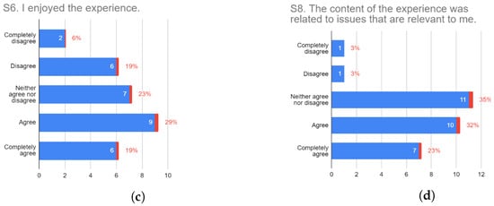 The questionnaire results, as presented in Table 1, provide insight into the participants’ outlook on the experience. As shown in Figure 7, 48% of the users enjoyed the experience (48%), 23% were neutral, and 21% did not enjoy it (Figure 7c). However, only 2% did not consider the experience relevant to them (Figure 7d). The narrative content of the experience, referring to challenging social and environmental issues of the recent past, resulted in some participants having feelings of sorrow (65%), disappointment (32%), or anger (13%) (Figure 5). Some participants reported, as already mentioned, curiosity (61%), satisfaction and excitement (14%), or nostalgia (26%). Negative or positive emotions indicate an affective connection with the experience, which strongly indicates that it was engaging for them. Smaller percentages of the participants reported indifference (10%), boredom (13%), or neutrality (10%). According to the responses to statement S3, 58% of the users felt that the experience made them observe the POIs more closely, and 26% were neutral (Figure 7a).
