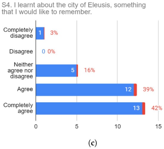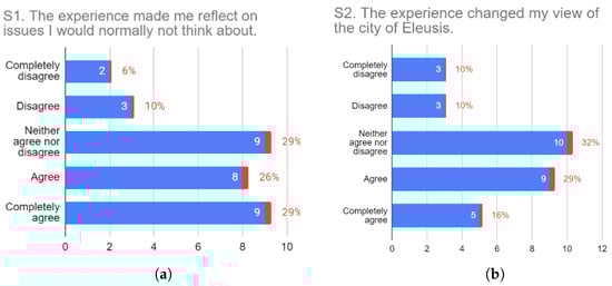 As already discussed in the previous section, the experience content focusing on the recent history of Eleusis and tackling complex environmental and social issues had an emotional impact on the participants. 65% reported feelings of sorrow, 32% disappointment, and 13% anger (Figure 5). Disappointment and sorrow were among the most prominent reported feelings, along with curiosity. This affective reaction indicates a more profound reflection on the presented issues. The questionnaire statement S1 confirms this. Figure 8a shows that more than 50% of the participants felt that the experience made them reflect on issues they did not usually think about, whereas 29% were neutral and 15% were negative. Similarly, many users felt that the experience changed their view of the city of Eleusis (45%) (Figure 8b), and the vast majority (81%) felt that they learned something memorable about the city (Figure 8c).