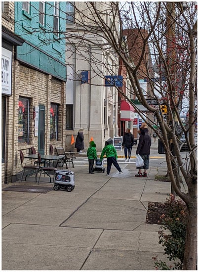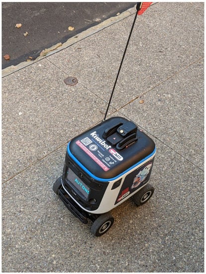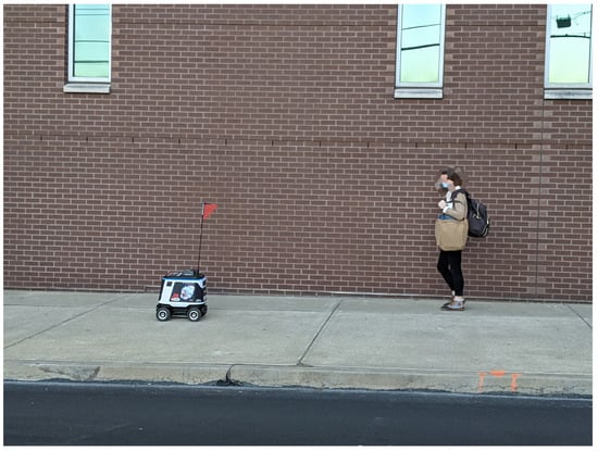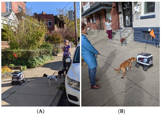 Abrams, Platte, and der Putten conducted a Wizard of Oz study in Aachen, Germany, with a remotely controlled sidewalk delivery robot [18]. During their public test sessions, they observed different interactions with people, including children being interested in the robot and wanting to know more and people being opposed to the robot’s presence, with one older couple verbally suggesting that the robot should not be allowed. In another study, Vroon et al. explored potential conflicts between people and PDDs through a Wizard of Oz intervention study conducted on public sidewalks in Delft, Netherlands [19]. Their findings showed that even when they deliberately staged a robot that ignored people, it was likely to cause conflict, with people needing to move out of its way. In general, they found that people would observe or take pictures with it, or avoid the robot altogether (this could be a novelty effect as, in general, this work suggests that people were fairly adaptable). Another Wizard of Oz study conducted in Utrecht, Netherlands, observed that many people ignored the robot as they walked by, but some fled [20]. In some cases, fleeing was due to people’s dogs; specifically, owners tried to rein in their dogs so that they could keep moving on their journey.