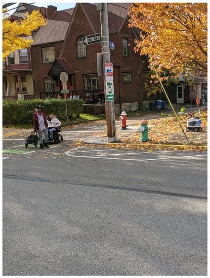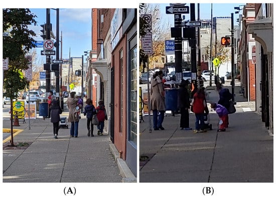 To learn more about and understand the PDD, the children obstructed the path and hindered the PDD’s movement. In the aforementioned scenario, four children and one adult have stopped on the sidewalk, effectively creating a hazard for other pedestrians. As the sidewalk became more crowded, and the attention of the pedestrians pulled away from their surroundings and into a singular place, the accessibility of the sidewalk changed (how situations like this might affect pedestrians with disabilities is discussed later in Section 4).