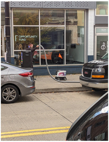 Our research sought to answer the question, “How do people interact with the PDDs over the course of this public pilot?” To answer this, we observed the deployment of Kiwibot delivery robots in the Bloomfield, Lawrenceville, and Garfield neighborhoods of Pittsburgh, PA, USA from 28 June to 15 December 2021. The first two authors conducted observations of the robots in public. When in the field, the observer would locate themselves along a route that the robot was traveling. The observer would either find a location where they could have a large field of view of the sidewalk, such as a café table, or to walk on the sidewalk through the neighborhood. The observer did not follow behind the robot to avoid being associated with the robot. The observer took pictures of people interacting with the robot from afar. The team observed the robots while they were mapping the sidewalk or conducting simulated deliveries to capture data on pedestrian interactions. Publicly, the ‘simulation’ was unknown, and pedestrians believed the robot was delivering to real customers. While observing, the team paid attention to various aspects of the interaction between the robot and people. These included how the robot moved along the sidewalk, how the robot interacted with someone when the travel path intersected with a person or a person approached the robot, basic information about the people and their behavior interacting with the robot, and any incidents where the robot was unable to move or needed assistance from a Kiwibot team member. We tracked demographic information of pedestrians, including the use of assistive mobility equipment, direct and indirect interactions with the device, along with proxemics and body language. In total, we observed 25 h of robot operation across 16 field observations. See Appendix A for a detailed observation guide. The observers captured photos and wrote detailed field notes following an ethnographic style of note-taking [41].