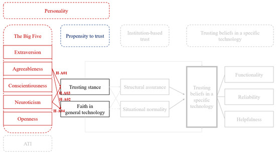 - H-A01: Agreeableness positively correlates with trusting stance.