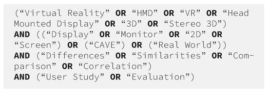 - The abstracts of each record were screened according to the following selection and deselection criteria: All articles related to the IVT we defined were selected (see Section 2.2 for definitions). If any of the research articles used augmented reality (AR) instead of VR, it was rejected. If an article compared both VR and AR, it was not rejected. It is also a balancing act to make the search query as broad as possible and as narrow as necessary. As a result, many articles were found that made a comparison with an HMD VR environment and not with another IVT. These articles were also rejected. If something other than the above IVT was compared, it would also be rejected. Languages other than English were rejected. Articles that did not adequately document their research or explain the reasoning behind their conclusions were rejected based on the “unsound methods” rejection criterion.