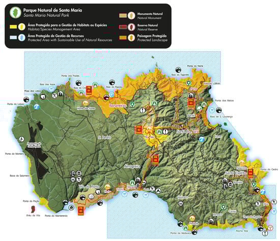 Santa Maria Natural Park, as shown in Figure 1, is composed of different areas that are classified into two Natural Reserves, one Natural Monument, four Habitat/Species’ Management Areas, three Protected Landscape Areas, and three Protected Areas with Sustainable Use of Natural Resources. To better explore the island, there are six official trails and one great route that goes through some of the Natural Park areas, these being: PR01SMA Costa Norte, PRC02SMA Pico Alto, PRC03SMA Entre a Serra e o Mar, PR04SMA Santo Espírito-Maia, PR05SMA Costa Sul, PR06SMA Areia Branca and GR01SMA Grande Rota de Santa Maria.
