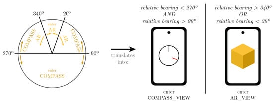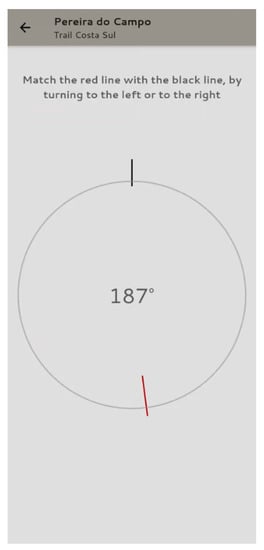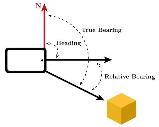 In general, mobile applications associated with hiking trails need to use concepts in the navigation field [] related to localization and orientation. To determine positions and distances, usually, they used Global Navigation Satellite System (GNSS) signals and the Haversine equation [,]. The diagram of Figure 2 helps understand the terms used, such as heading, true bearing, and relative bearing [,].