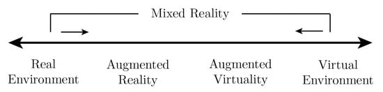 Milgram and Kishino [] describe the notion of a virtuality continuum (Figure 3), where at one end are the totally real environments, and at the other end are the totally virtual environments (Virtual Reality). Mixed Reality is everything in between these two extremes and is the most general and broad term to describe the core area of the virtuality continuum.