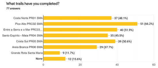 In order to characterize the target audience and understand their needs, a questionnaire was conducted which counted 77 responses from residents (63–81.8%) and visitors (14–18.2%) of the island of Santa Maria. Of these, only 12 had never been on a trail, and the most popular trail was the PRC02SMA Pico Alto (completed by 51 respondents), followed by the PRC03SMA Entre a Serra e o Mar and PR05SMA Costa Sul trails (completed by 40 and 39 respondents, respectively), as shown in the graph in Figure 4.