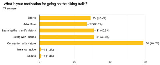 When asked about the frequency with which they hike, 40.3% reveal that they do it very rarely (about once a year), 26% rarely (about once a month), and 20.8% regularly (about once a week). According to the graph of Figure 5, the major motivation for going on the trails is the connection with nature that they provide (76.6%); however, they also consider that it is important for them to know more about the history of the island and that this is a good way to spend time with friends (40.3% in both cases).