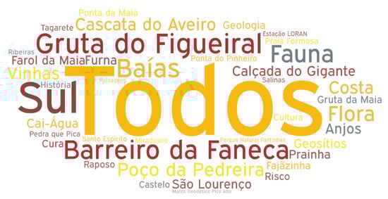 A word cloud (words in the Portuguese language) was created to illustrate the main points of interest mentioned by the participants (Figure 6). In general, the participants think that all (“Todos”) the points of interest are important, but the most mentioned ones are “Gruta do Figueiral”, “Barreiro da Faneca”, and “Costa Sul”.