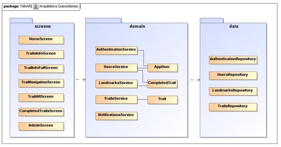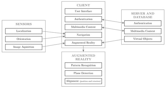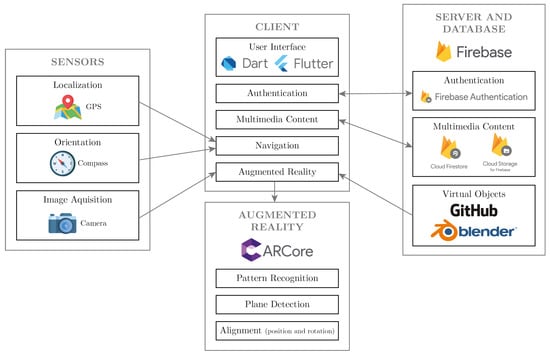 This system consists of a mobile application (Client) that includes two main modules (Navigation and Augmented Reality) with the functionalities defined previously (Section 3.2), depending on the type of user. To do this, it is necessary to access the Sensors available on the smartphone, as well as a set of tools available to implement the Augmented Reality component.
