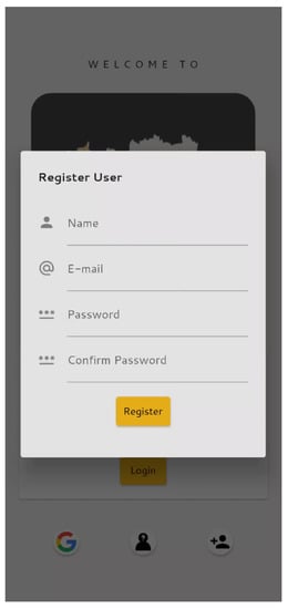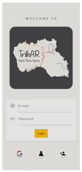 The launching screen (HomeScreen) is shown in Figure 10, where the authentication options are provided, including the registration, shown in Figure 11. After that, the users are redirected to the screen shown in Figure 12 (TrailsInfoScreen). A trail can be chosen by clicking on the markers on the map.