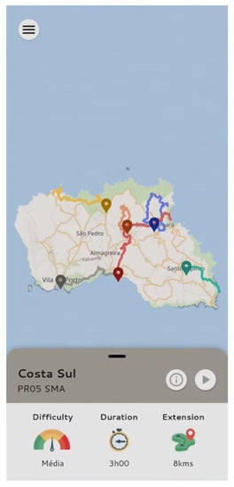Selecting a trail allows the user to observe some basic information about it in the sliding panel shown in Figure 13, such as the difficulty, duration, and length of the trail.