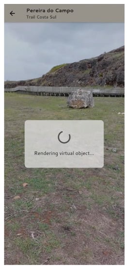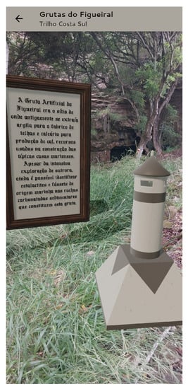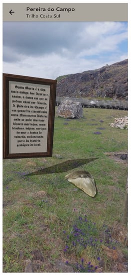 Most users revealed that they had never used Augmented Reality applications on their smartphone before and the integration with the island’s hiking trails was very interesting. It also increased their curiosity about the technology itself and its different applications. In addition, they also considered it a good feature to send the notification near the point of interest to draw the attention of visitors. As for the objects presented, most of them liked them, but they liked the object that was modeled especially for this purpose (Figure 31) even more, since it better fits with the place and represents the island of Santa Maria. In this experiment, the application used a set of general 3D objects obtained in the free assets store and a specific 3D object for the Santa Maria Island created in the scope of this work. In the future, it is planned to create more specific 3D models to enrich the visit to the island of Santa Maria.