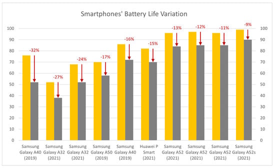 In order to test the battery life with different types of smartphones, users were asked to indicate the battery value at the beginning and end of the hiking route. After analyzing the data obtained, the average battery consumed during the tests was 13.6%. In the graph of Figure 28, it can be observed that, for the most part, older devices have a higher battery drain than newer devices.