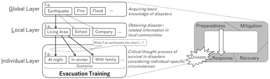 Evacuation training is regarded as a part of long-term disaster education in the Mitigation phase and a practical activity in the Preparedness phase. To maximize the benefits of evacuation training, Mitsuhara et al. proposed a comprehensive model of disaster education, including evacuation training [23]. The proposed model “GLI” consists of three layers: Global, Local, and Individual. Although encouraging people to follow the Global, Local, and Individual Layers in order, the GLI model allows shuffling among the layers. Figure 1 shows the GLI model together with the cyclic model of disaster management.