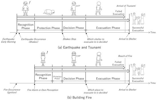 We propose an evacuation process generalized for unpredictable disasters. This process has four phases in the timeline: recognition, protection, decision, and evacuation. Figure 2 shows the proposed process together with example events in (a) an earthquake and the resulting tsunami and (b) building fire.