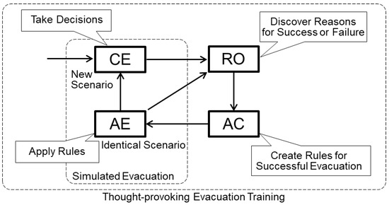 The CE and AE stages aim to provoke decision-making, and the RO and AC stages aim to provoke thinking objectively of the process of evacuation. The CE stage should induce failure in moderately challenging scenarios. This is because a participant is expected to think more in the RO and AC stages when failing in the CE stage. The proposed model regards following the four stages as a thought-provoking evacuation training and recommends repeated participation in evacuation training in various scenarios.