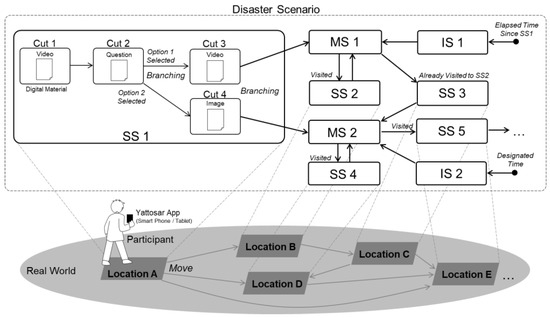 Interrupt Scene (IS). Each IS, independent of locations, corresponds to an elapsed time or a designated time and expresses a time-dependent situation. In an earthquake scenario, for example, a participant may encounter afterquakes suddenly, regardless of their current location.