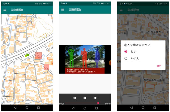 Digital materials. The left picture shows a map displaying a participant’s current location (the green arrow) and visitable SSs (red rectangles). The middle picture shows a video expressing the situation, “I remember an evacuation route. Let’s evacuate quickly before tsunami arrives”. The right picture shows a single-choice question asking about the situation, “Do you rescue the elderly?”.