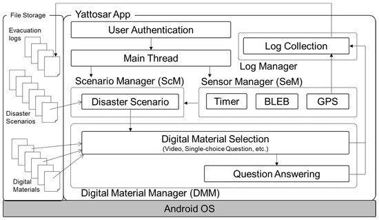 We developed a geo-fencing mobile application called “Yattosar” using a programming language, Kotlin. Note that a user needs to download disaster scenarios and digital materials from the scenario authoring system to the mobile application before starting evacuation training. The developed application comprises the following main modules. Figure 6 shows the module composition.