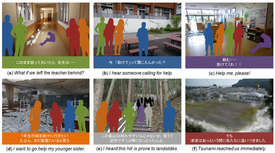 Against the situation of “unreliable shelter”, Groups A and D took decisions to stay there in 44 s (AE-A-4) and 20 s (AE-D-2), respectively. Groups B and C took decisions to leave there and move to another shelter in 41 s (AE-B-3) and 40 s (AE-C-2), respectively. All the groups needed a longer time to take decisions because their opinions were bisected. Members who claimed “stay” denied residents’ statements (i.e., possible landslide) and predicted that the remaining time to reach another shelter is not enough. Members who claimed “leave” believed residents’ statements and predicted that they could reach another shelter within the remaining time. These decision-making times are unavoidable because they had to think of various risks and weighed the two decisions. Occasionally, a rumor during a disaster amplifies distrust and influences decision-making. Spending time in decision-making may indicate that they thought and took decisions in emotional disturbances as if they were in real disaster situations and that the created scenario provided high situational and audiovisual realism. Against the situation of “crowded shelter”, Groups B and C took decisions in 25 s (AE-B-5) and 21 s (AE-C-3), respectively. They seemed to decide on another shelter while being upset over consuming the remaining time. If they kept calm, decision-making time might have been shortened. Against the situation of “whether to confirm”, Groups A and C immediately decided not to confirm family members’ safety (AE-A-1 and AE-C-4). They may have taken a decision based on the principle of successful evacuation (shown in Section 4.3.1). Group B also decided not to confirm, but they needed 21 s to take the decision (AE-B-6). This may be because they increased their upset due to the successive difficult decisions. We assumed that group members’ personalities can influence their decisions, particularly when they have emotional disturbances (e.g., temporal upset) caused by encountered disaster situations.