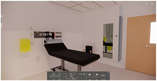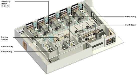 To test whether BIM metadata can be viewed within a VR headset (Oculus Quest 2, https://www.meta.com/nz/quest/products/quest-2/ accessed on 19 May 2023), an Operating Unit of a hospital was designed and built in Autodesk Revit (https://www.autodesk.co.nz/products/revit/overview?term=1-YEAR (accessed on 28 April 2023)), a leading piece of AEC software. The operating unit was broken up into two unique modules; (1) the Theatre Module and (2) the Recovery Module. The Operating Unit modules were then exported from Revit using Unity Reflect (https://unity.com/products/unity-reflect (accessed on 28 April 2023)) into the Unity Game Engine (https://unity.com (accessed on 28 April 2023)). Unity Reflect maintains the fidelity of the BIM metadata, enabling its use within the Unity Game Engine. The models were also exported using the Revit plugin, Enscape (https://enscape3d.com/ (accessed on 28 April 2023)), to create the 3D desktop model; this meant that the same models and datasets could be used for the Virtual Reality condition of the experiment and the PDF + 3D model condition of the experiment. The two modules, Recovery Unit and Theatre Unit, were designed using the Australian Health Facilities Guidelines—Operating Unit as a guide []. The standard room sizes, finishes and fixtures were derived from or taken directly from the Australasian Health Facility Guidelines (AusHFG: https://healthfacilityguidelines.com.au/australasian-health-facility-guidelines (accessed on 28 April 2023)) and their Autodesk Revit library. AusHFG is widely used throughout Australia and New Zealand in the design of hospitals. Figure 1, below, is a 3D view from the Theatre Module Revit file. Figure 2 illustrates the Recovery Module.
