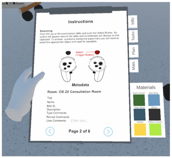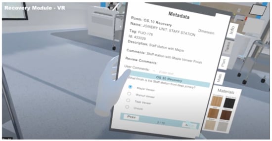 As identified by Sidani et al. [], little research has been carried out on the use of non-geometric BIM data within VR. This paper aimed to address this. Other research suggests that the use of plans and technical information alongside VR models is helpful. The above results generally reflect what other researchers have found—that VR is a useful tool to review spatial and geometric data. By including technical data alongside the geometry, however, we were able to demonstrate that VR can be used to review the technical specifications required in a healthcare project (see Figure 11, below, for an example of the metadata within the VR prototype).
