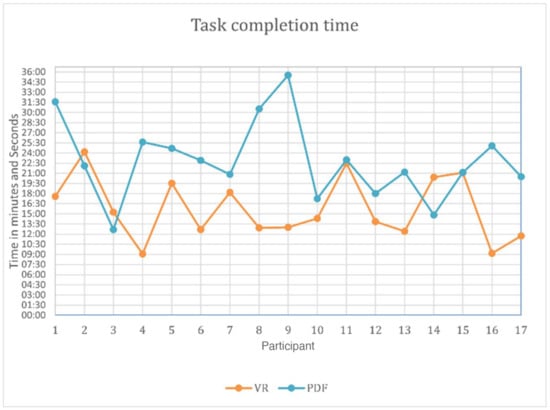 The amount of time each participant took varied significantly. For the VR condition, the quickest time was 9 min and 5 s. The shortest time for the PDF condition was 12 min and 40 s. The longest VR time was 21 min and 5 s, while the longest time in PDF was 35 min and 3 s. The mean time in VR was 15 min and 45 s, while the mean time in PDF was 22 min and 46 s. Figure 8, below, illustrates how much time each participant took to complete the tasks. The task completion time was converted into seconds, and a Wilcoxon signed-rank test was run over the figures to determine significance. With Z = −2.864 and p = 0.004, the time difference was statistically significant.