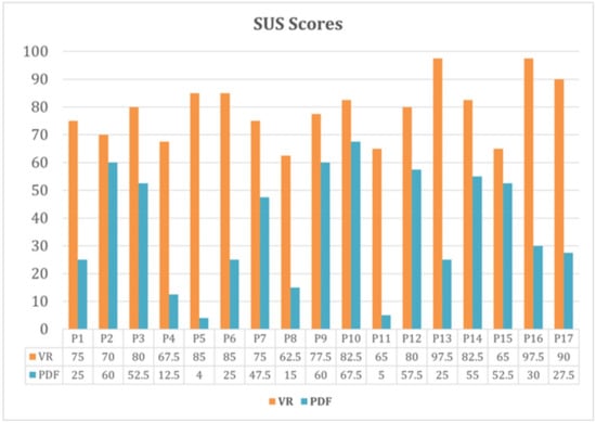 The VR condition also scored considerably higher on the SUS survey, with 78.70 as the average SUS score (SD = 10.65) compared to 38.67 (SD = 19.31) for the PDF and 3D model condition. The accepted ‘passing’ SUS score was considered to be 68 [], and as such only the VR condition was considered as passing. A Wilcoxon signed-rank test was carried out and showed statistical significance between the SUS results, with Z = −3.624, p = 0.001. The lowest SUS score for the PDF condition was 5, while the lowest for VR was 62.5. The highest PDF score was 67.5, while the highest for VR was 97.5. See Figure 9 for a graph of the SUS scores.