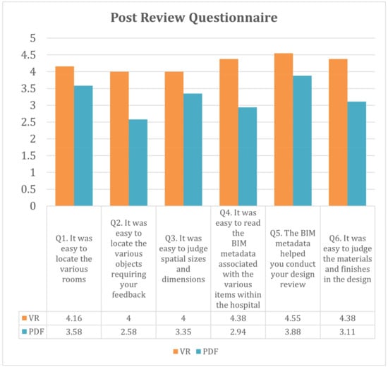 The results illustrate that VR was perceived as more usable than the PDF condition. The SUS scores were significantly higher in favour of VR. In the post-review questionnaire, in all six questions the VR condition received a higher rating.