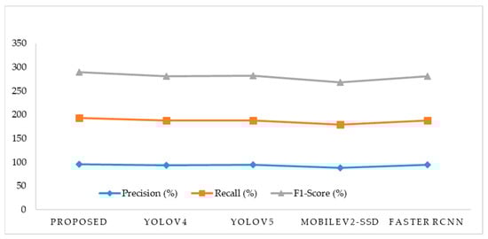 The performance of the proposed model for object detection and accessibility for people with visual impairments was compared with that of existing approaches. It was compared with other state-of-the-art models called YOLOv5, SSD, and Faster RCNN. YOLOv5 is the unofficial copy of YOLOv3 with some modifications that have been implemented in PyTorch. This model achieves a high F1 score of 93.99%. It is a very light model and needs less time to train for a custom dataset, but in most cases, it could not compete with the YOLOv4 in accuracy. SSD is a popular single-shot object detector which is trained with backbones such as VGG-16, Inception, ResNet, etc. This model achieves a higher F1 score of 89.54%. Faster RCNN is the third version of RCNN released in 2015. It is a two-stage detector. Two-stage detectors are slower than one-stage detectors. Before the release of YOLOv4, it was the most famous model regarding accuracy. Using Faster RCNN, the higher F1 score of 93.82% was achieved, as shown in Table 3 and Figure 3. The outcomes showed that the suggested method produced more accurate object identification with an F1 score of 96.34% and more thorough and accurate descriptions using text-to-speech conversion. For input-image sizes of (416, 416), the YOLOv4 reaches real-time inference speeds ranging from 20 to 40 frames per second (FPS). Similar to this, the YOLOv5 reaches inference speeds between 30 and 50 FPS for the given images. MobileNetV2-SSD obtained faster inference times of 50 to 70 FPS at the expense of significantly worse accuracy. Compared to the other models, the faster R-CNN is a region-based object identification model that achieves excellent accuracy but has somewhat longer inference times (5 to 10 FPS). The proposed model, which has real-time object identification capabilities, reaches inference speeds of 60 to 80 FPS for 416 × 416 input images.