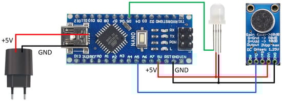Figure 2 presents a circuit diagram of the proposed device. The circuit is designed to be powered either by an adapter or via the USB port of a personal computer. In particular, the device demonstrates efficient power management; with the RGB digital LED and microphone module having low current consumption (<100 mA), they are powered directly by the single-board microcomputer. The RGB diode is controlled via digital pin D5, while the microphone is connected to analog input A5, ensuring seamless integration and functionality within the proposed device.