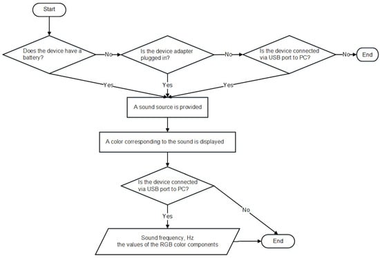 A battery (power bank) can be added to the device. When providing power, the device reacts to each sound source by visualizing the corresponding color, and when connected to a computer, it provides information about the sound frequency in hertz and the values of the RGB color components. Figure 3 shows a block diagram of the standard operating procedure for handling the device.