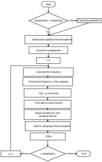 Figure 4 shows a block diagram of the loop() function of the proposed program. The proposed program allows sound visualization through a frequency map to the corresponding RGB values and their visualization through an RGB LED. The program continuously reads audio samples, calculates the frequency, and updates the LED color accordingly. The serial monitor provides real-time feedback on frequency and RGB values.