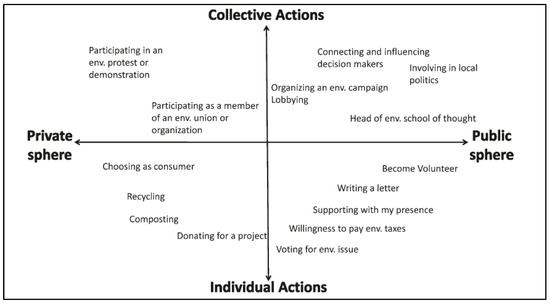 The goal for achieving more pro-environmental behavior is considered a prerequisite for addressing environmental problems and is a key driver of sustainability [18]. This is also reflected in the notion of environmental citizenship (EC), which has regained great attention in recent years due to the environmental crisis and refers to the obligation of each citizen to contribute to the conservation of the surrounding environment [12,19]. On one hand, EC highlights the need to equip people with an adequate body of knowledge, skills, values, attitudes and behaviors in order to be transformed into “environmental citizens” [20,21,22]. On the other hand, as presented in Figure 1, EC emphasizes that citizens should be able to participate in society as “agents of change”, via the undertaking of both individual and collective pro-environmental actions, situated in the private and public sphere [23,24,25,26,27].